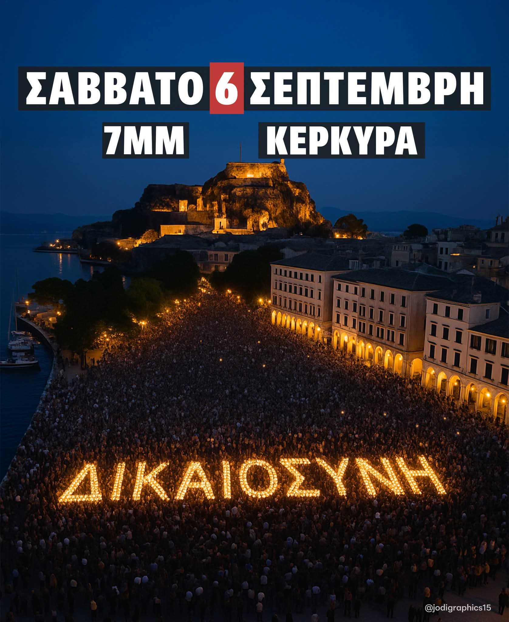 Πανελλαδικό κύμα διαμαρτυρίας για την τραγωδία των Τεμπών κορυφώνεται αύριο, Σάββατο 6 Σεπτεμβρίου 2025, στις 7 το απόγευμα, με συγκεντρώσεις σε δεκάδες πόλεις της Ελλάδας, μεταξύ των οποίων και η Κέρκυρα. Στο νησί, οι πολίτες θα σχηματίσουν τη λέξη «ΔΙΚΑΙΟΣΥΝΗ» στο Πεντοφάναρο, στέλνοντας μήνυμα απαίτησης λογοδοσίας εν όψει της Διεθνούς Έκθεσης Θεσσαλονίκης.