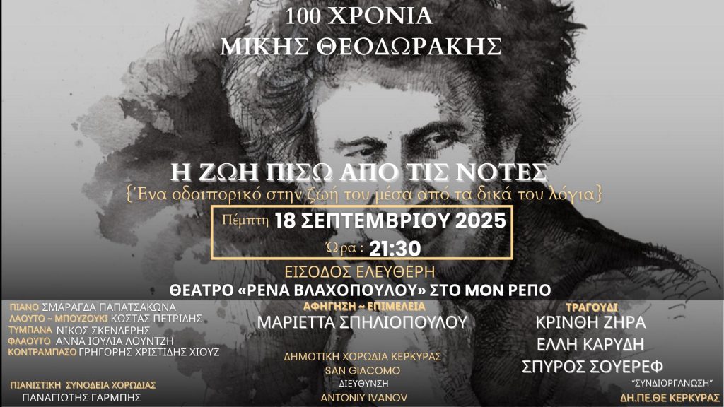 Με αφορμή τη συμπλήρωση 100 χρόνων από τη γέννηση του Μίκη Θεοδωράκη, δύο σύγχρονες καλλιτέχνιδες : η τραγουδίστρια Κρίνθη Ζήρα και η ηθοποιός-ραδιοφωνική παραγωγός Μαριέττα Σπηλιοπούλου, σε συνδιοργάνωση με το ΔΗ.ΠΕ.ΘΕ. Κέρκυρας και την συμμετοχή της Δημοτικής Χορωδίας «San Giacomo», ενώνουν την τέχνη τους για να παρουσιάσουν ένα πρωτότυπο μουσικοθεατρικό αφιέρωμα που ξεχωρίζει. Όχι άλλη μία συναυλία. Όχι μια συνηθισμένη βιογραφική αφήγηση. Αλλά ένα ζωντανό podcast επί σκηνής, σε μια παράσταση που θα ταξιδέψει το κοινό στις λιγότερο γνωστές πτυχές της ζωής και του έργου του εμβληματικού δημιουργού. Μια εμπειρία που δεν μοιάζει με καμία άλλη: μια αφήγηση που γίνεται μουσική και μια μουσική που ζωντανεύει μέσα από τις λέξεις.