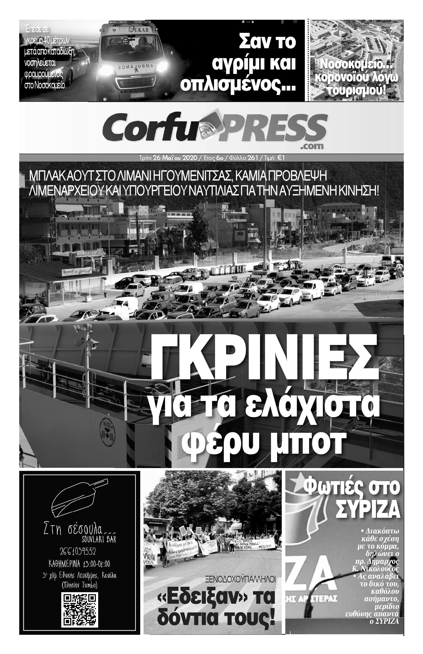 Το πρωτοσέλιδο της CorfuPress (26/5/20)