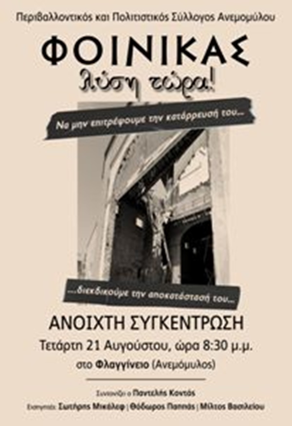 Ανοικτή συγκέντρωση για το "Φοίνικα" διοργανώνει ο Σύλλογος Ανεμομύλου